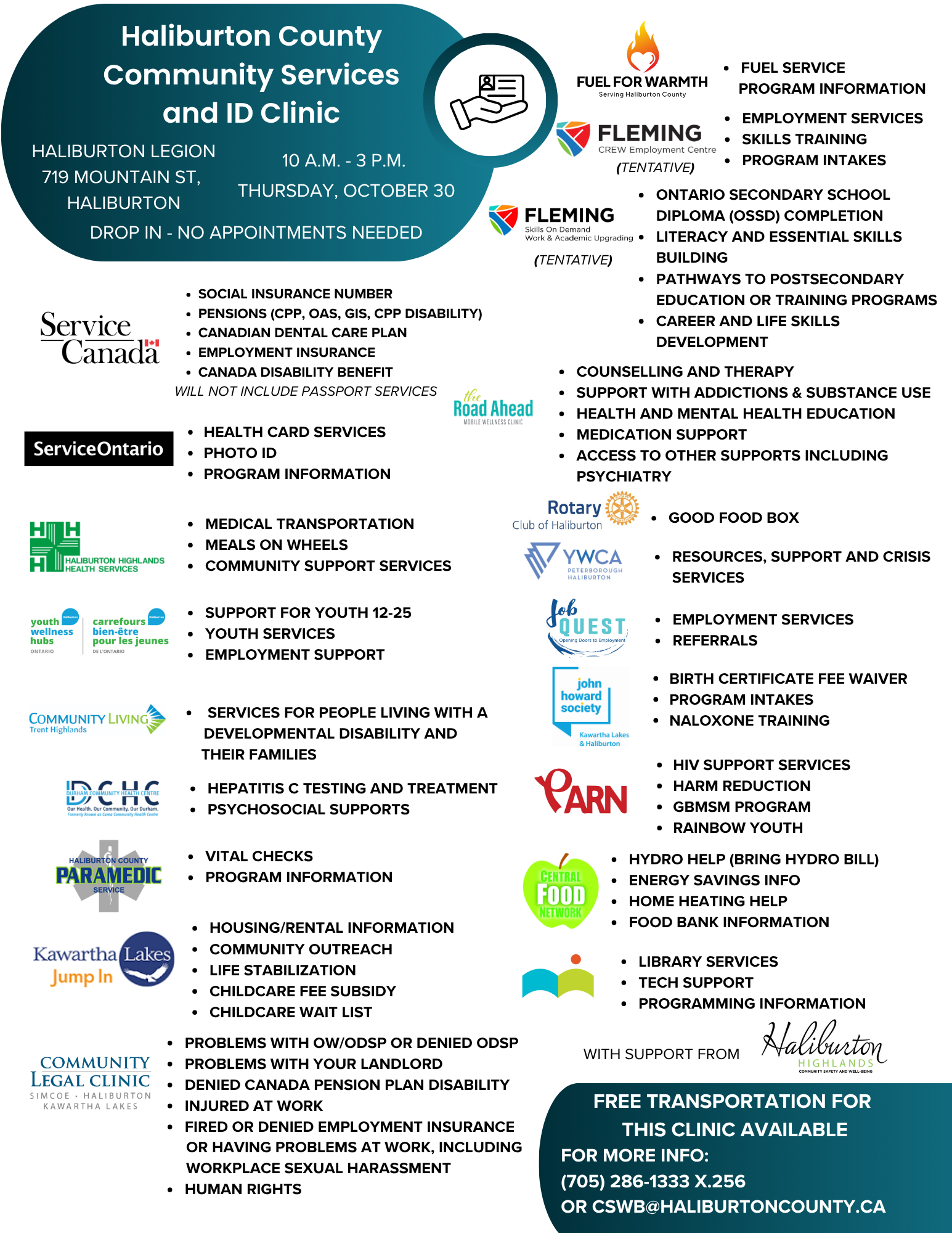 Service Canada and Service Ontario will join local organizations and agencies at the Haliburton Legion from 10 a.m. to 3 p.m. to offer the County's third Community Services and ID Clinic.